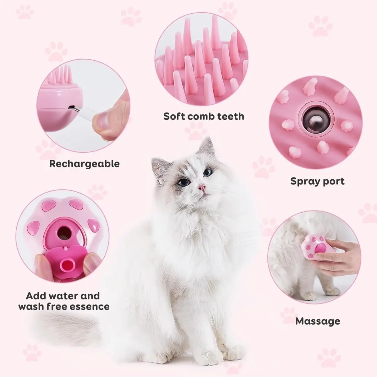 Este dispositivo 3 en 1 no solo cepilla, sino que también masajea y utiliza vapor para eliminar la suciedad y el pelo suelto, mejorando la salud del pelaje de tus mascotas.