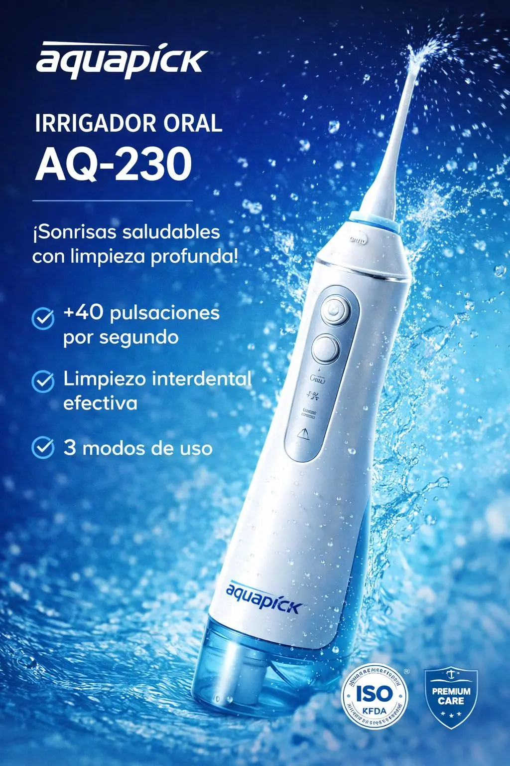 El irrigador oral inalámbrico AQ–230 permite complementar la higiene dental de manera eficaz, especialmente en presencia de bolsas periodontales